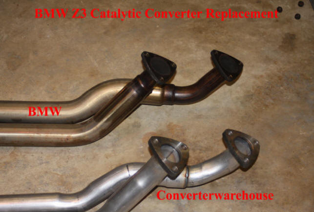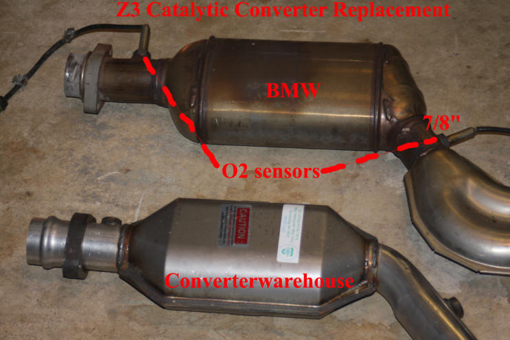 (11) Laid BMW and Converterwarehouse Z3 converter side by side and noticed difference to include: Converterwarehouse actual converter much smaller than BMW; pre converter oxygen sensor port on Converterwarehouse is much further forward than on BMW; Converterwarehouse converter routes both exhaust ports to a single pipe much sooner than the BMW. ???? Another Internet search and examination of what images there are provided of replacement "bolt-on" catalytic converters reveals all, or most, bolt-on replacements appear identical to the Converterwarehouse converter.