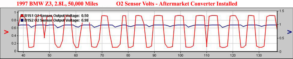 Note: above shows the volts out of the pre and post cat O2 sensors after a new genuine BMW converter was installed. To be clear, the only thing changed was the aftermarket converter was removed and the genuine BMW installed. No changes were made to the engine and the very same O2 sensors were used. As shown above, the post cat O2 sensor is now stable in output like it should be.