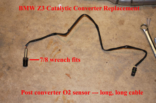(12) As bought new oxygen sensors, mounted both into new converter. Found 7/8" wrench would draw each sensor up tight in the converter. No problem mixing up the 2 sensors as the post-converter sensor has a much longer cable than the pre-converter sensor. I did use anti-seize compound on the threads of each sensor and was careful not to touch the actual sensor.