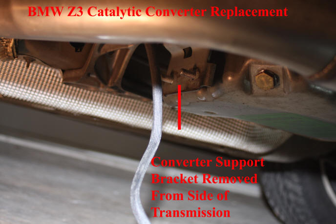 (3) Loosened but did not remove catalytic converter support bracket attached to side of the transmission. 13mm.